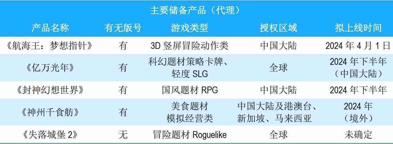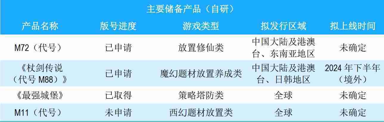 公司储备的多个自研、、、代理产品都在有序推进当中,,涵盖放置类、、策略类、、、模拟经营类、、、RPG、、、、Roguelike等多元化游戏品类,,储备的主要自研和代理产品如下:::