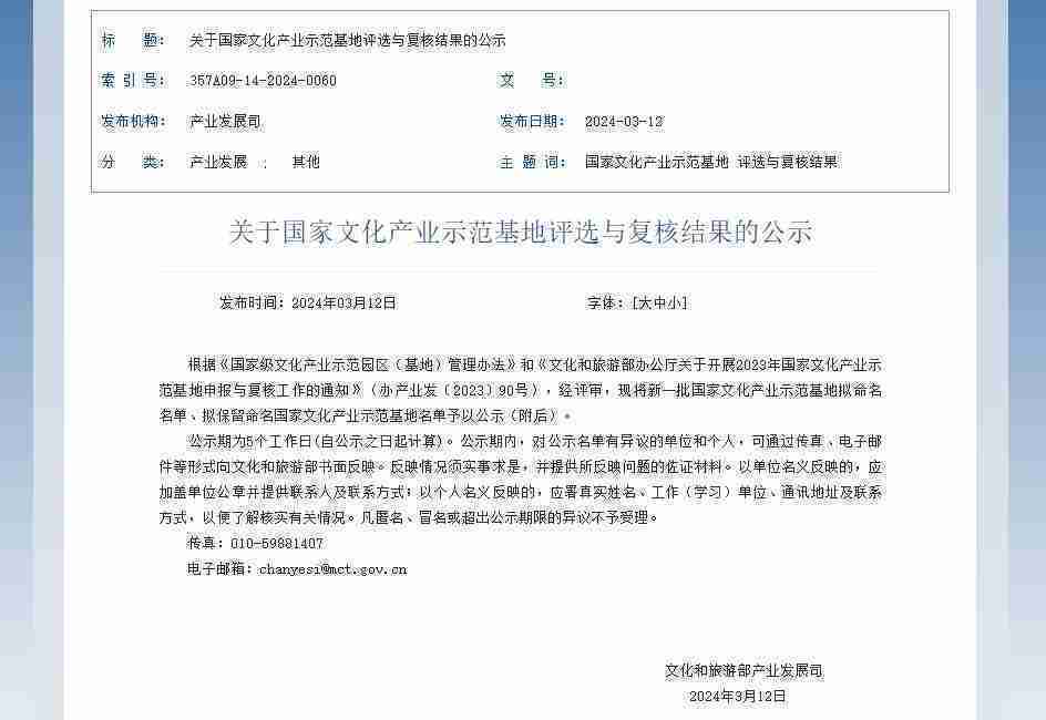 新一批国家文化产业示范基地公示,,yaxin111成功入围
